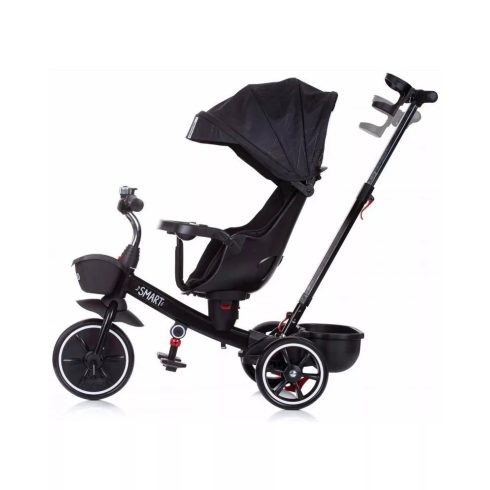 A hátsó kerekei felett egy műanyag tárolókosár van a játékoknak, továbbá a tolókaron egy pohártartó is helyet kapott.