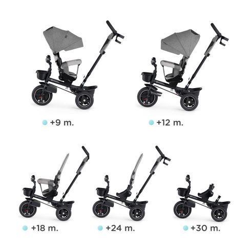 A SPINSTEP-et 5-féleképpen lehet használni:● sportbabakocsi (az ülés a menetiránynak háttal),● tricikli a legfiatalabbak számára (az ülés a menetiránnyal megegyezően),● kistricikli 18-24 hónapos gyermekek számára (kinyitott kupolával),● idősebb gyermek számára a karfa és a biztonsági öv leszedhető (a szülő a rászerelt tolókar segítségével továbbra is korlátozhatja a gyermek triciklivel történő közlekedését),● külön tricikli azon gyermekek számára, kik készen állnak erre a kalandraA fizikai aktivitás rendkívül fontos a gyermek egészsége és fejlődése szempontjából. Azzal, hogy a gyermekednek megtanítod e tricikli segítéségével, hogy mennyire fontos ez, pozitív hatást fejtesz ki egészségére. A SPINSTEP-nek köszönhetően gyermeked megszereti a mozgást és az aktív időtöltést. A SPINSTEP 5 az 1-ben tricikli minden egyes sétát egyedivé tesz, hihetetlen élményt nyújt a gyermek számára. A tartós PU kerekek mind a városban, mind pedig az erdőben megállják a helyüket. Jól megtapadnak a felületen, ellenállnak a kiszúródásnak, a hátsó kerekek csapágyazottak. A SPINSTEP szabadkerék-funkcióval is el lett látva - amíg gyermeked kicsi, lekapcsolhatod a pedálhajtást, ezáltal gyermeked a tricikli meghajtása nélkül gyakorolhatja, hogyan kell pedálozni. Kordában tarthatod a gyorsaságot és az irányt is.A tricikli 360 fokban forgatható üléssel rendelkezik, amelyet a szülővel szembe és menetiránynak megfelelően is beállíthatunk - a gyermek magabiztosabb lesz, ha tudja, hogy figyelsz rá. A mély, szabályozható, vízálló, és UPF50 szűrővel ellátott kupolának köszönhetően zápor és szél esetén is védelmet nyújt a gyermek számára, épp mint egy sportbabakocsi! A séta kényelméért a puha huzattal ellátott kényelmes ülés és a magas háttámla a felelős. A háttámla megfelelő támaszt nyújt a gyermeknek a világ felfedezése közben. A kistricikli 3 pontos biztonsági övvel és leszerelhető karfával lett ellátva, így ha gyermekünk készen áll, egyedüli utazásra is használhatja a triciklit. Jól tudjuk, hogy a folyamatos pedálozás fárasztó lehet a kisgyermek számára, azért a SPINSTEP tricikli kényelmes lábtartókkal is fel lett szerelve, amelyekre nyugodtan felteheti a lábát, ha pihenésre van szüksége. A szülők számára pedig fontos előny a 3 magasságban állítható tolókar, amelyet kellemes tapintású, puha hab fed. Elég csak beállítani a tolókar hosszát, hogy magasságunkhoz alakítsuk. A SPINSTEP-et éveken át használhatja gyermeked, mivel tartós acélból lett megalkotva, változtatható az ülés és a pedálok távolsága. Ha a gyermeked már nagyobb lesz, akkor is gond nélkül méretéhez igazíthatod. A triciklihez hasznos kiegészítőket is kapsz, pl. kistáskát a szülő számára (amely a tolókarra tehető), valamint két kis kosár a gyermek játékai számára. A SPINSTEP összecsukható, így nyaralásra vagy a nagyszülőkhöz tett látogatásra is magaddal viheted. A SPINSTEP használatával minden séta igazi élmény lesz!ElőnyökBiztonság:● A “szabad kerék” funkciónak köszönhetően a gyermek a tricikli hajtása nélkül is pedálozhat. A szülő kontrollálja az utazás sebességét!● A SPINSTEP-et szabályozható, 3 pontos biztonsági övvel és puha védő elemekkel is felszerelték. Így nem csak a gyermek kényelmét, de biztonságát is növelik.● Levehető, puha karfa, amely megkönnyíti a gyermek behelyezését és kivételét. Középen található a nyitó gombja, ezáltal a szülő egy kézzel is kinyithatja.● A csúszásgátló gumimarkolatok biztos tartást garantálnak, növelik a kis triciklis magabiztosságát és biztonságát.● Az acélváz igen masszív és tartós, ezáltal a SPINSTEP éveken át hasznotokra lesz.● A mély, szabályozható, vízálló, UPF50 szűrővel ellátott kupola megvédi a gyermeket a záportól, a széltől és a naptól is.● A hátsó kerekeknél fék is van, a szülő is lefékezheti a járművet.Kényelem:● Behajtható lábtartójának köszönhetően hosszas pedálozás után megpihenhet gyermeked. Ezenfelül támaszt is nyújt azon csöppségek számára, akik még nem tudnak egyedül tekerni.● Az 5 az 1-ben SPINSTEP triciklit könnyen össze lehet csukni - könnyebb elvinni nyaralásra, és az egyes funkciók közötti váltáshoz nincs szükség szerelésre. Összehajhatóságának köszönhetően könnyebb otthon is tárolni.● A triciklit könnyű tisztán tartani - a háttámla huzatát könnyen le lehet szedni, könnyen áttörölhetjük nedves szivaccsal.● A szülő számára kialakított tolókar kellemes tapintású habbal lett befedve, amely biztos fogást garantál. Ezenfelül 3 fokozatban állítható - könnyen méretedhez alakítod.● A plusz kiegészítők még kellemesebbé teszik a sétát. Két kosár (egy nagy hátul, és egy kicsi elöl), amelyekbe mindenféle kiegészítő belefér. A te cuccaidnak a tolókaron elhelyezett kistáska biztosít helyet, amely szintén a készlet része.Funkcionalitás:● A 360 fokban forgatható ülésnek köszönhetően a gyermek szülővel szemben vagy szülőnek háttal is utazhat. Ezáltal a SPINSTEP már kb. 9 hónapos kortól használható akár sportbabakocsi helyett is.● Egyes elemeit könnyű szétszedni, nem kell szerelni hozzá. Ezáltal a triciklit könnyen a gyermek igényeihez alakíthatjuk.● A SPINSTEP 9 hónapos kortól 5 éves korig használható! Kupolája, karfája és tolókarja leszerelhető.● Az ülés és a kormány távolsága szabályozható, így a SPINSTEP-et könnyen a gyermek méretéhez igazíthatjuk. A gyermekek gyorsan nőnek, de ezzel a triciklivel ez nem probléma!● PU-ból készült tartós kerekei jól tapadnak az adott felülethez, a tricikli aszfalton és erdőben is használható. A SPINSTEP mindig veletek lehet függe