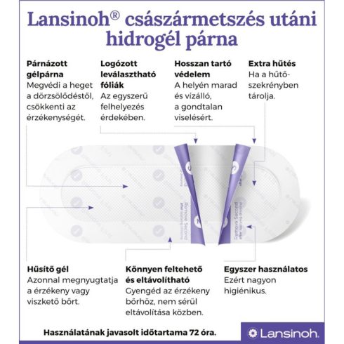 A metszés miatt a kismamáknak gondot okozhat a mozgás, újszülöttjük gondozása. A seb helye érzékeny lehet, hajlamos a ruházat miatti dörzsölődésre, de viszkethet is.1 csomagban 2 db hidrogél párnát tartalmazA Lansinoh császármetszés utáni hidrogél párna Magas víztartalma miatt nedves környezetet biztosít, amit meg is tart a bőr gyógyulásához. Megszünteti a heg érzékenységét, viszketését, védi a ruházat dörzsölésétől. Hűsítő, főleg ha használat előtt hűtőbe teszed. Vízálló, zuhanyzás közben is viselhető. Diszkrét, akár 72 órán keresztül használható. Higiénikus, egyszer használatos, egyesével csomagolt.Ha fertőzést vagy annak gyanúját tapasztalod, akkor ne használd, hanem fordulj orvoshoz!Használata:1.lépés: Győződj meg arról, hogy a terület tiszta és száraz, mielőtt felhelyezed a hidrogél párnát. 2.lépés:Nyisd ki a tasakot és húzd ki a párnát3.lépés:Távolítsd el az 1.jelű védőpapírt4.lépés:Finoman helyezd a párna zselés oldalát közvetlenül a császármetszés hegére.Középről kifelé haladva gyengéd, simító mozdulatokkal rögzítsd a párnát.5.lépés:Távolítsd el a 2. védőpapírt is. A párna eltávolításakor finoman emeld meg a felső szélekről indulva lefelé, figyelj, hogy alul a szőrnövekedés irányába húzd. A hűsítő hatás érdekében használat előtt tárold a párnát hűtőszekrényben. Ne használd a párnákat más olajokkal, krémekkel vagy kenőcsökkel, mert az akadályozhatja a párna megtapadását.