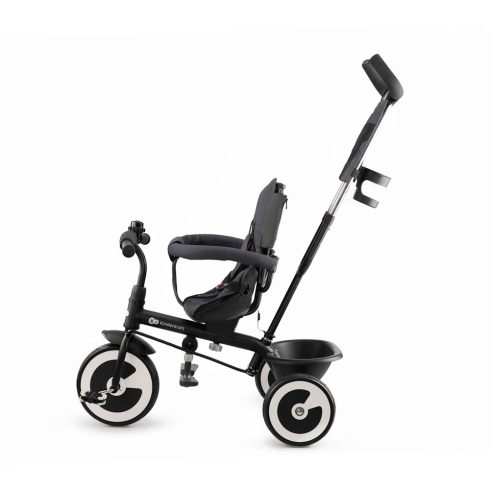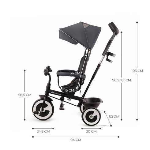 Átlátszó ablakkal a kupolán, így a szülő rá tud látni menet közben is a kicsire. Az 5 pontos biztonsági és egy plusz kiegészítő öb a lábak között biztosítja a maximális biztonságot. Biztonsági karfa övvel a kiegészítő védelem érdekében, ezt bármikor a gyermeknek már nincs szüksége.A hátsó kerekeken lévő fékekkel megállítható a tricikli úgy is, hogy a kicsi rajta ül. A kihajtható lábtámaszon tudnak a kis lábak pihenni, ha elfáradtak.Két nagy zsebbel rendelkező erős anyagból készült táska segít a kis dolgok tárolásában, míg a nagy tárolókosárba kényelmesen elférnek akár a játékok is. Pohártartójában akár kávét vagy a kicsi italát is tudjuk tárolni.Mérete: 92 x 50 x 115 cmA szülőtolókar magassága: 103.5 cm-től 108.5 cm-ig