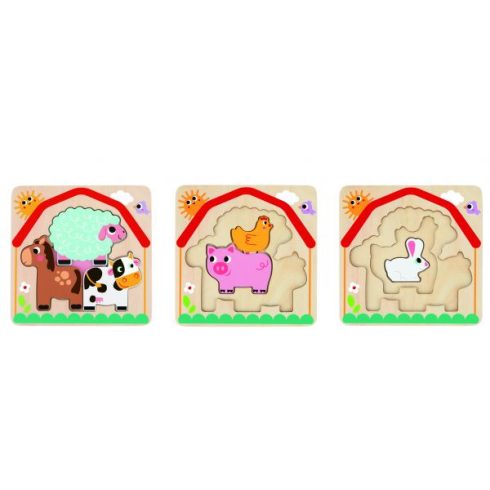 A formakirakó egy vidám, szórakoztató és nem utolsó sorban remek fejlesztő játék a legkisebbek számára. Ez a többrétegű formakirakó a tanya állatkáit tartalmazza, akiket egymás mellé, alá és fölé illesztve rakhatnak ki a kicsik. A házikó formájú alapon az állatok sziluettje látható, így könnyen odailleszthető a megfelelő elem. A legalsó állatka a nyuszi lesz, a középső réteg a malac és a tyúk, a legfelső pedig a bárány, a boci és a lovacska.