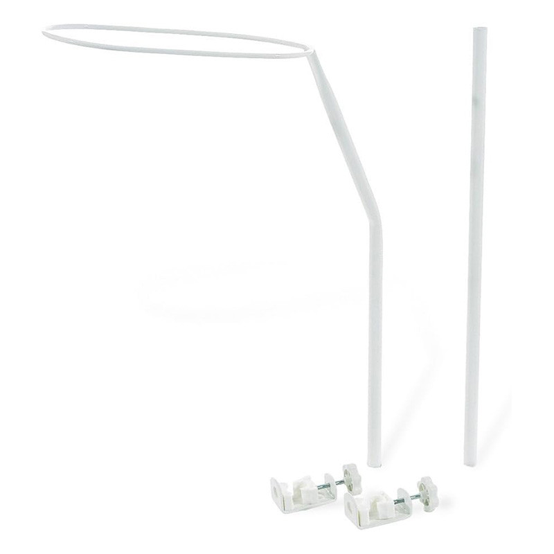 Két ponton, stabilan rögzíthető, fehér színű, fém, univerzális baldachin vas. A kiságyhoz fúrás nélkül, könnyen rögzíthető. A honlapon elérhető baldachinfüggönyökkel kompatibilis. A baldachin öltözteti a babaszobát, csökkenti a beszűrődő fényeket, így járul hozzá a baba nyugalmához.