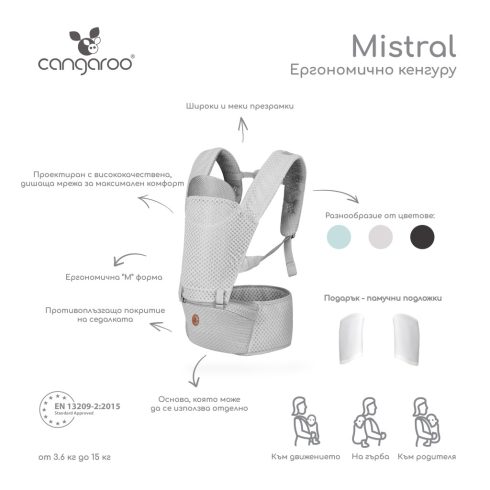 Az ergonomikus, talpas babahordozó 5+ hónapos és 15 kg-os gyermekek számára alkalmas.