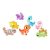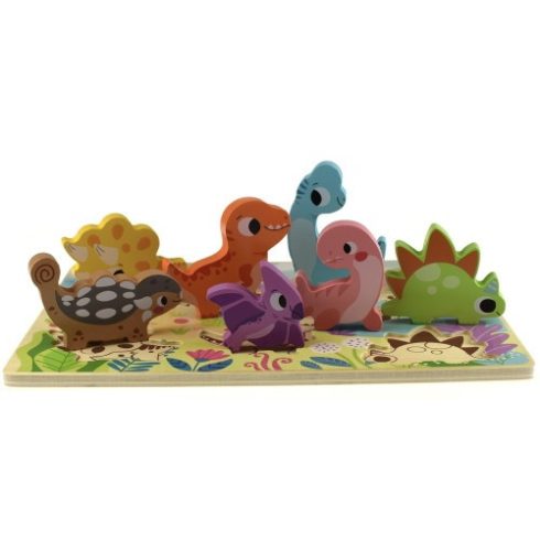 Fa formakirakó játék színes dinókkal. A piciknek nincs más dolguk, mint megragadni az aranyos, színes dinókat, majd a helyükre illeszteni. Összesen 7 db dinót tartalmaz, amelyeket a képek segítségével a helyükre tudnak tenni.