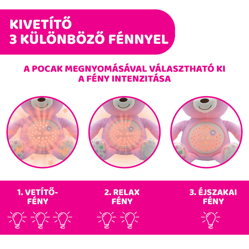 Nagyon puha plüss maci, ami zenél, fényeket vetít a falra, illetve éjszakai fényként is használható.