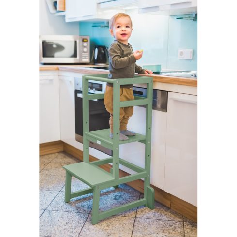 Nem csak ránézésre szép és modern, de egyszerű kialakításával minden lakókörnyezetbe tökéletesen illeszkedik és rendkívül stabil, és oldalsó támaszaival valamint masszív felépítésével kiváló védelmet nyújt a felborulás ellen. Mivel kicsikéink olyan gyorsan nőnek, így az alaplap magassága is tökéletesen állítható a gyermek pillanatnyi magasságához. Amint elsajátították a felfelé vezető utat, a kerek rúd a tartásra és természetesen a kiesés elleni védelemre szolgál. Így gyermekünk bárhol segíthet, legyen szó főzésről, sütésről vagy akár fogmosásról, ez a torony ideális segítő, amikor a lábak rövidnek tűnnek. A szülőkkel vagy idősebb testvérekkel szemmagasságban való játék és tanulás segít a gyermeknek abban, hogy nagyon gyorsan megtapasztalja a szociális interakciókat, fejleszti készségeit, és segít megerősíteni az egymás közötti kötődést.