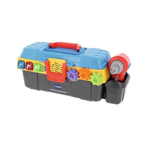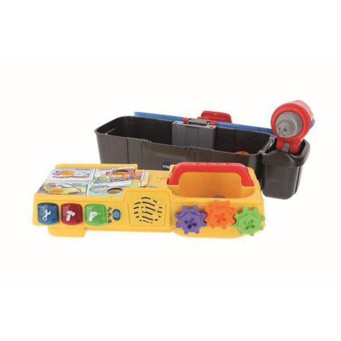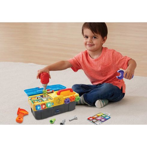 A világító gombok megnyomásával aktiválhatóak a vidám dalok. A projektkártyákat használva megjavíthatóak a hibás eszközök az utasítások alapján, a piros fogantyúval pedig bárhova könnyedén elvihető a ládikó.A játék három játékmódban használható:1. Szabad játékmód: A három szerszámos gomb megnyomásával a gyerek megismerheti a szerszámokat, színeket és különböző dalokat hallhat. Ha nincs behelyezve projektkártya, dalok és rövid mondatok hallhatóak. Projektkártya behelyezésekor a csavarok befúrásával és a szegek beütésével megismerheti a számokat, a színeket, a betűzést, a járműveket és pár otthoni tárgyat. Minden ötödik aktivitás után (csavar befúrása, szeg beütése, stb.) egy jutalom dal kerül lejátszásra.2. Kvíz mód: Itt az ideje, hogy a kisgyerek megmutassa, mit tud! A kérdésekre a szegek beütésével, a csavarok befúrásával vagy a szerszámos gombok megnyomásával lehet válaszolni.3. Zene mód: A dalok meghallgatásához projektkártyát kell behelyezni, vagy meg kell nyomni a szerszámos gombokat. A dalok a szerszámokról, a számokról és a színekről szólnak.Az elemek élettartamának növelése érdekében a játék automatikusan kikapcsol, ha nem kap utasítást pár percig.Csomagolási méret: 28 x 20 x 13 cmTartalom: 1 db szerszámosláda, 1 db Elektromos projekttálca, 1 db csavarkulcs, 1 db kalapács, 1 db fúró, Csavarok, Szegek, 2 db kétoldalas projektkártya. A játék elemmel működik (2db AA). Az elemeket megtalálod a csomagban.