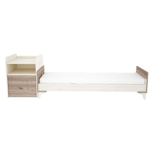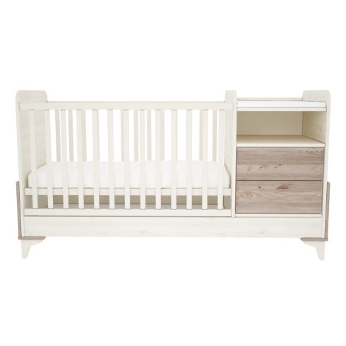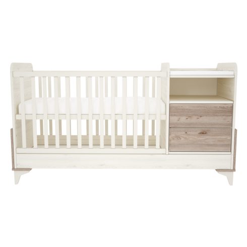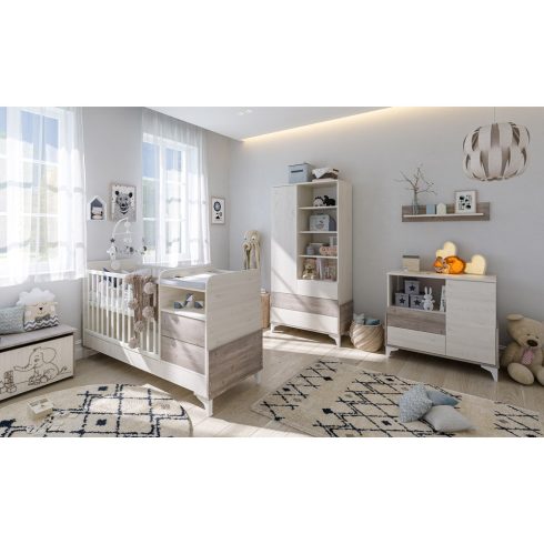 Kombinált kiságyunk megfelelő választás kisebb babaszobák berendezése során, hiszen kombinálja a klasszikus rácsos kiságyat a pelenkázószekrénnyel, ám jóval kisebb helyet foglal el, mint a két bútordarab külön-külön. A kiságyon a pelenkázószekrény a szobához alkalmazkodva jobb és bal oldalra egyaránt felszerelhető. A terméken található fiókok nem rendelkeznek fogantyúkkal mivel nyomásra nyílnak és záródnak.Heverővé és éjjeliszekrénnyé alakíthatóA kiságy rácsos-babaágyként körülbelül 3 éves korig (max. 15 kg), junior gyermekágyként pedig körülbelül 12 éves korig használható. A kiságyból az oldalrácsok eltávolítása után, és apelenkázószekrény leemelésével, egy ifjúsági heverőt és egy éjjeli szekrényt kapunk. A kiságy könnyedén átalakítható, nincs szükség pótalkatrészek megvásárlására, ezek a termékkel együtt járnak.AnyagaTömör- gőzölt bükkfa és színtartó felületű laminált bútorlap.FelületeBükkfa elemink felülete kizárólag vizes bázisú természetbarát anyagokkal kezelt. Felületeit először egy szállekötő és alapozó anyaggal, ezt követően egy fedő, majd egy speciális vizes bázisú lakk réteggel kezeljük. Ezen többrétegű behatás által az átlagosnál egy jóval magasabb védelmet, tartósságot valamint élettartamot tudunk elérni a kezelt fa felületén. Laminált bútorlapjaink magas minőségű, kemény színtartó laminálással vannak ellátva. Tisztításuk ennek köszönhetően gyors, egyszerű és biztonságos.Élek és sarkokTermékeink élei lekerekítettek. A bútorlapok élei 2 mm vastag ABS-sel kerülnek élzárásra, melyek ahagyományos élfóliákhoz képest sokkal magasabb minőséget nyújtanak. A termék minden élét és sarkát mellyel a használat során Ön vagy akár gyermeke érintkezhet ezzel az anyaggal zártuk lemelynek lekerekítésének köszönhetően a bútor nem rendelkezik éles sarkokkal és élekkel.