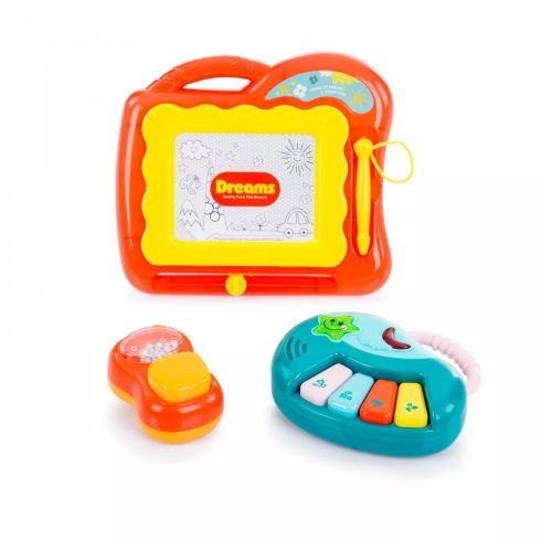 - különböző játékok, melyek lekötik a gyermek figyelmét és fejlesztik a képességeit: mágneses rajztábla, mini pianino, csörgők, tekerhető, nyomkodható gombok, lapozgató, telefon