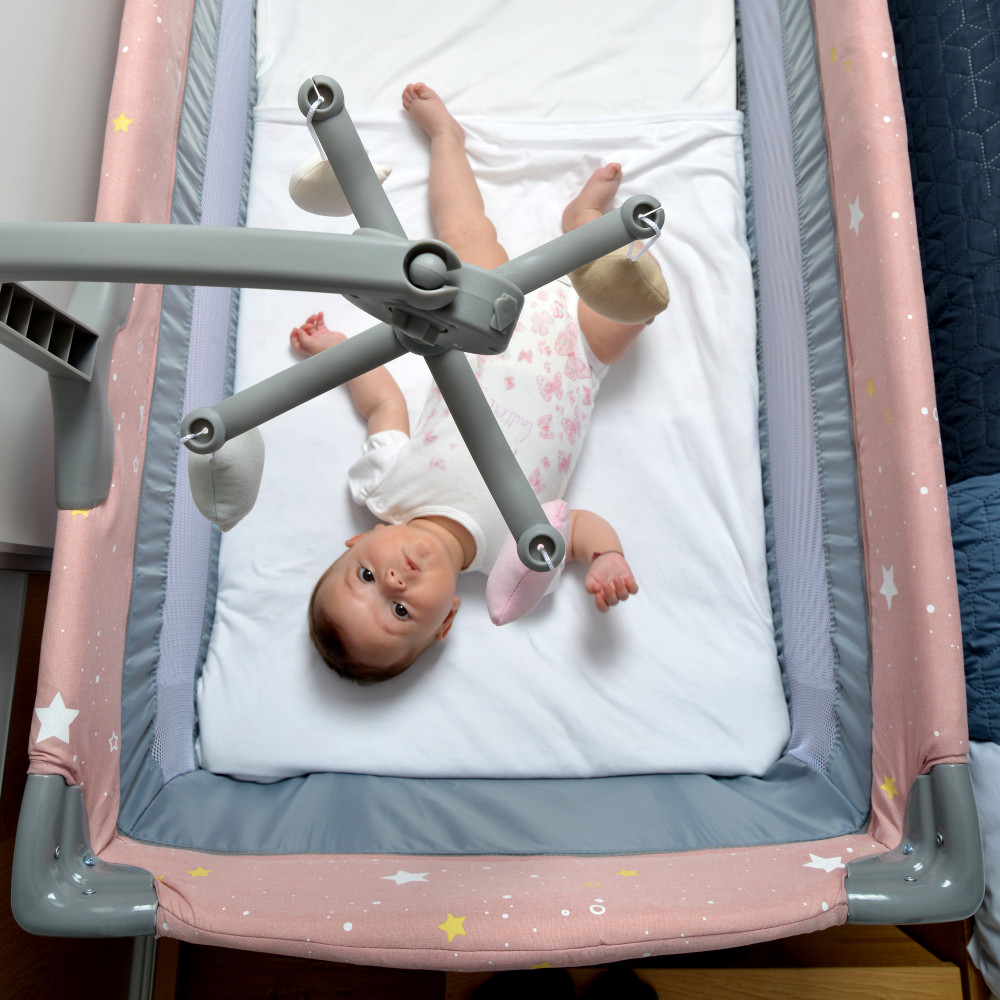 Könnyen összecsukható és szállítható, így otthoni használatra és utazásokra is ideális. A második réteg kialakítása arra lett optimalizálva, hogy a 0-6 hónapos babák számára kényelmes alvási lehetőséget biztosítson. A maximum teherbírása 15 kg, magasságkapacitása pedig 90 cm-ig terjed. De nem csak praktikus, hanem szórakoztató is: a forgó játék dallamos zenével kápráztatja el a kicsiket. Ez az utazóágy minden bizonnyal a babák és a szülők kedvence lesz.