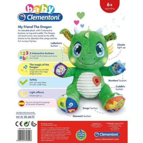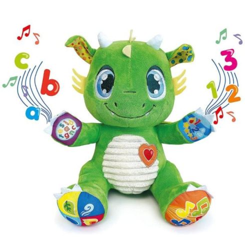 Interaktív tanuló plüss bébisárkány öt interaktív gombbal. Számok, betűk, dalok és mondókák játszva tanulásában remek partner. Az interaktív gombok a sárkány mancsain helyezkednek el. A sárkány pofijai világítanak. A játék biztonságos, nem mérgező anyagokból készült, fejleszti a gyerekek érzelmi, és finommotorikus képességeit.