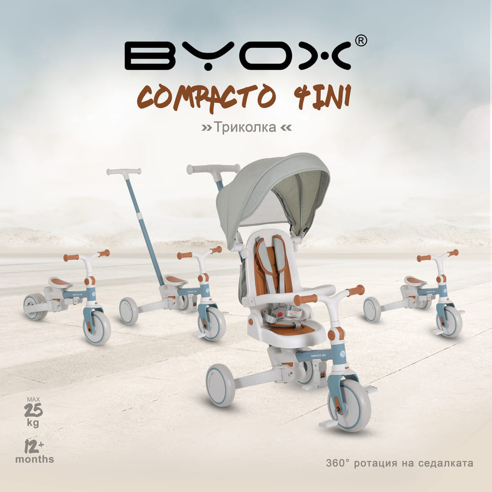 Compacto 4 in 1, Byox – a háromkerekű kerékpár, amely a gyermekével együtt növekszik! A multifunkcionális Compacto 4 in 1 háromkerekű kerékpár úgy lett kialakítva, hogy alkalmazkodjon gyermeke igényeihez – az első sétáktól az első önálló kerékpározásokig.