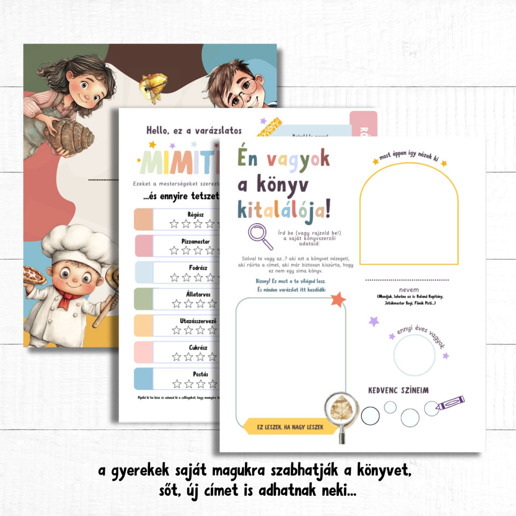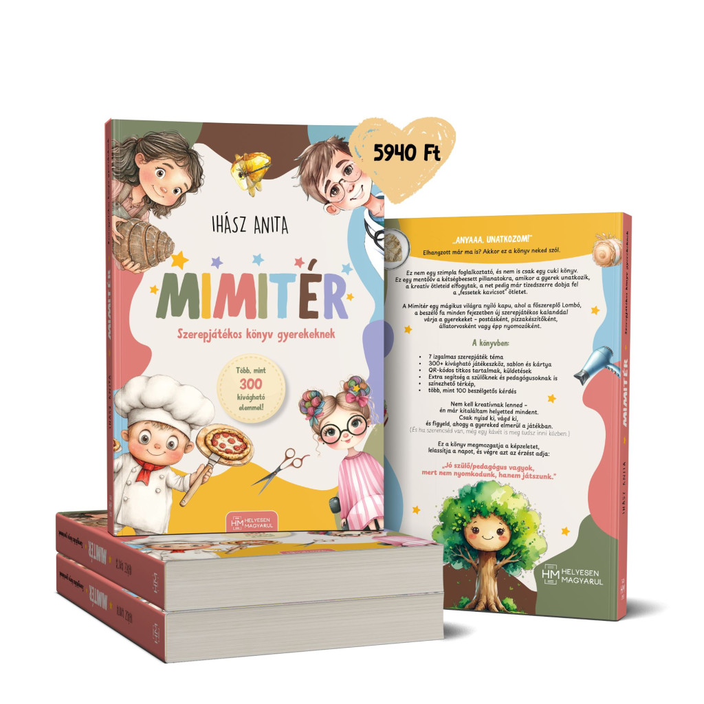 Azoknak a 3–9 éves gyerekeknek készült, akik imádják kipróbálni, milyen egy cukrász, állatorvos, régész vagy éppen barkácsmester bőrébe bújni. A könyvben 7 izgalmas szakma vár rájuk, mindegyikhez sztorik, szerepkártyák, kivágható kellékek és még barkácssarok is jár. És hogy fokozzuk az izgalmat: minden fejezetben rejtőzik egy QR-kód, ami titkos extrákhoz vezet (csak a legbátrabb kalandoroknak ajánlott. A végén pedig oklevél jár – mert egy igazi hős megérdemli az elismerést. Szóval, ha eddig a Pinterest anyukák ötletei miatt fájt a fejed, itt a könyv, ami helyetted találja ki a kreatív játékot. A Mimitér nem csak könyv – hanem a családi szabadidő új legjobb barátja