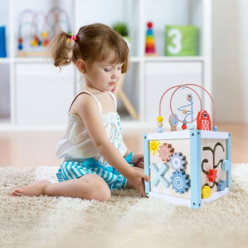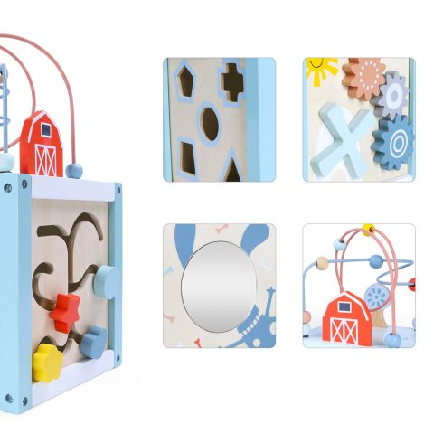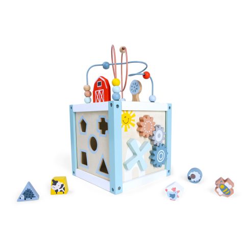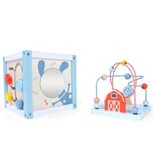 Egy aranyos kocka, amely rejtvényeket rejt. A kocka oldalain forgó faformák vannak, különböző motívumokkal. A játék fejleszti a koordinációt, a térbeli képzelőerőt és a kézügyességet. A golyók és formák mozgatása megtaníthatja a gyerekeknek az első számolásra és színfelismerésre. A tevékenységek minőségi fából és vízbázisú festékekből készülnek.