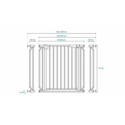 • Könnyed, egykezes nyitás. A nyitógomb megnyomását követően kissé meg kell emelni a kaput, melyre a gyerekek nem képesek, így nagy biztonságot jelent. Önzáró mechanizmus.• 24 órás védelem! Érzékelő szenzorral ellátott ajtórács, mely szürkületkor aktiválja a led fényforrást, mely megvilágítja a korlátot. A működéshez 1 db AAA elem szükséges.• Nem tartalmaz éles széleket, így sem a falon, sem emberben nem okozhat sérülést • 90 fokban nyitható mindkét irányban• Az ajtórácsok közötti távolság kb 5-6 cm.• Fúrás nélkül felszerelhető • Anyaga: fém• Méret: 77x75-105 cm• Szabvány: EN1930:2011