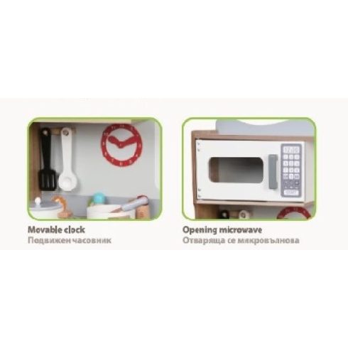 2. Kiváló Minőségű Fa Anyag: A babakonyha tartós, környezetbarát fa anyagból készült, ami garantálja a termék hosszú élettartamát.