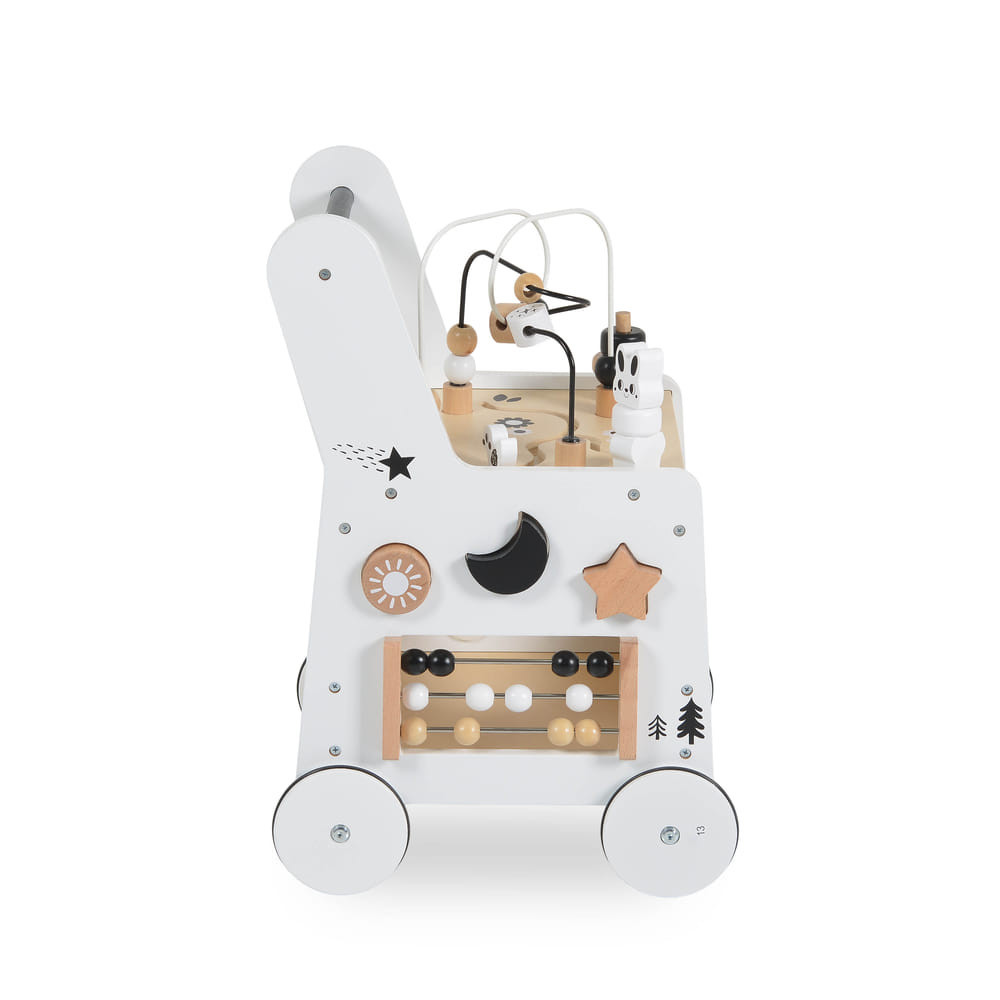 Támogassa gyermeke első lépéseit ezzel a Moni Toys által gyártott, kiváló minőségű anyagokból készült fa járássegítővel. A járás közbeni stabil támasztás mellett különböző tevékenységeket is kínál, amelyek a játékidőt szórakoztatóvá és tanulássá teszik.