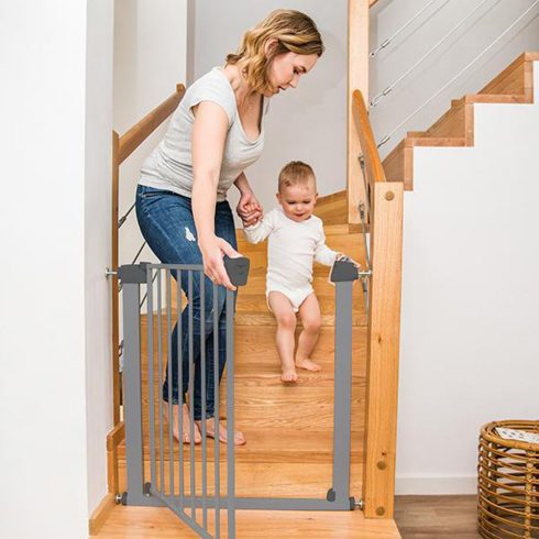 A termék megfelel az EN 1930 szabványnak. Telepítés előtt olvassa el a használati utasításokat!- befeszítéses rögzítőrendszer – nincs szükség fúrásra- szilikon kupakok a rögzítőcsavarokhoz, hogy megakadályozzák az ajtókeretek és a lépcsők sérülését- állítható szélesség75-82cm két 7cm-es toldalék- biztonságos kettős zárrendszer, teljesen biztonságos, ugyanakkor elég kényelmes ahhoz, hogy egy kézzel is ki tudja nyitni a kaput- kiváló minőségű acél szerkezet- mindkét irányba nyílik- önzáró rendszer- A STOP funkció lehetővé teszi a kapu tárva-nyitva tartását- nincsenek éles szélek- színe: szürkeSzélessége: 75 - 96 cm (toldalékokkal)Magassága: 77,5 cmSúlya: 4,35 kgA készlet tartalma:- biztonsági kapu 2x 7cm-es toldalékkal- 4 rögzítőcsavar fém kulcs- csavaros rögzítőkészlet- sínerősítő hosszabbító beépítési pont- használati utasítás